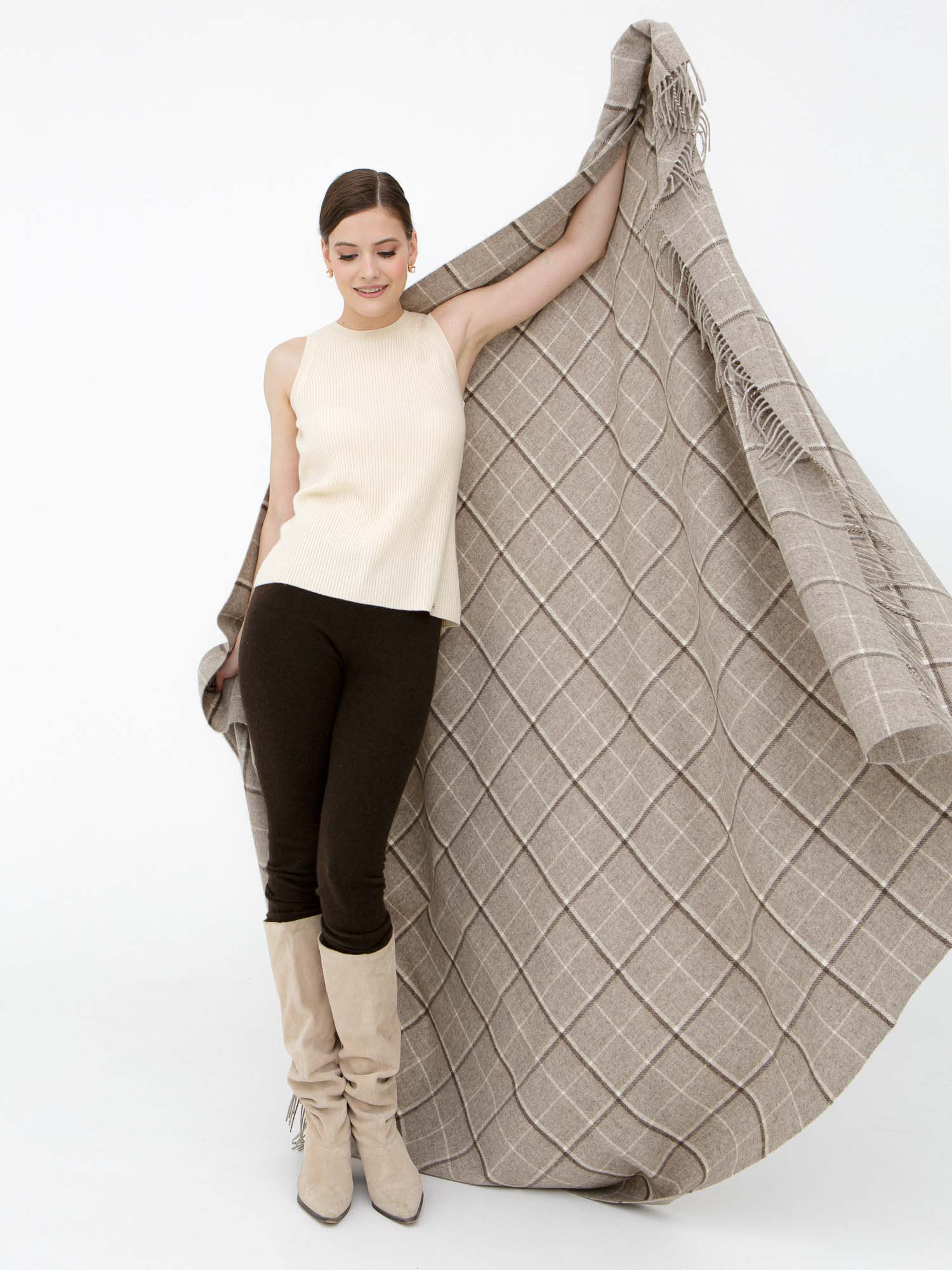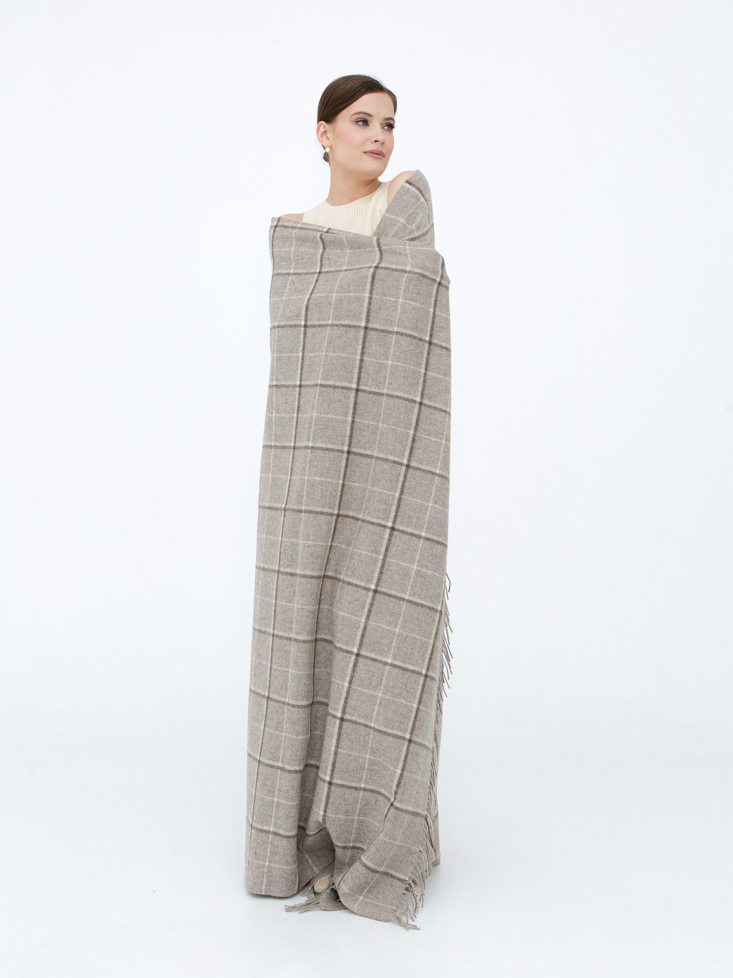 Роскошный плед из натуральной шерсти яка в благородной бежево-коричневой гамме с классическим клетчатым узором — идеальное сочетание уюта и изысканного стиля. Благодаря уникальным свойствам шерсти яка плед отличается исключительной мягкостью, лёгкостью и способностью сохранять тепло даже в самые холодные дни. Крупный размер и деликатная бахрома по краям делают его универсальным: он прекрасно подойдёт как для домашнего уюта, так и в качестве стильного аксессуара для пикника или загородного отдыха.