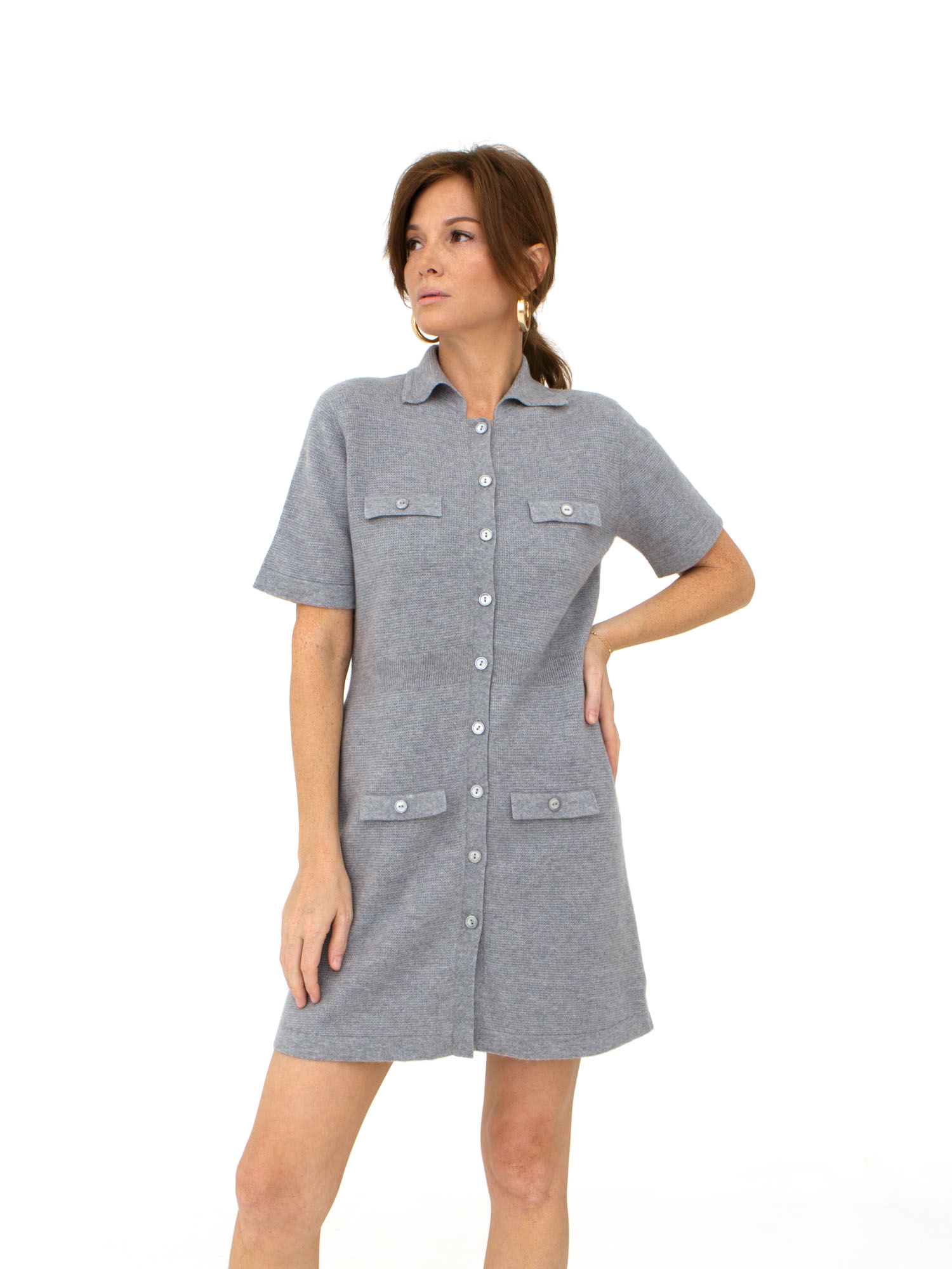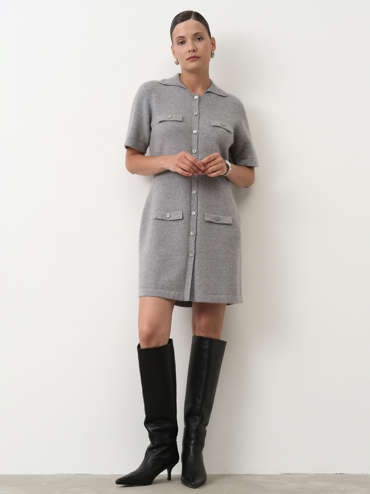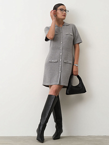 Платье имеет классический крой с воротником и застежкой на пуговицы по всей длине, что добавляет ему элегантности и делает его удобным для носки. Накладные карманы на груди и внизу придают модели легкий акцент и функциональность.