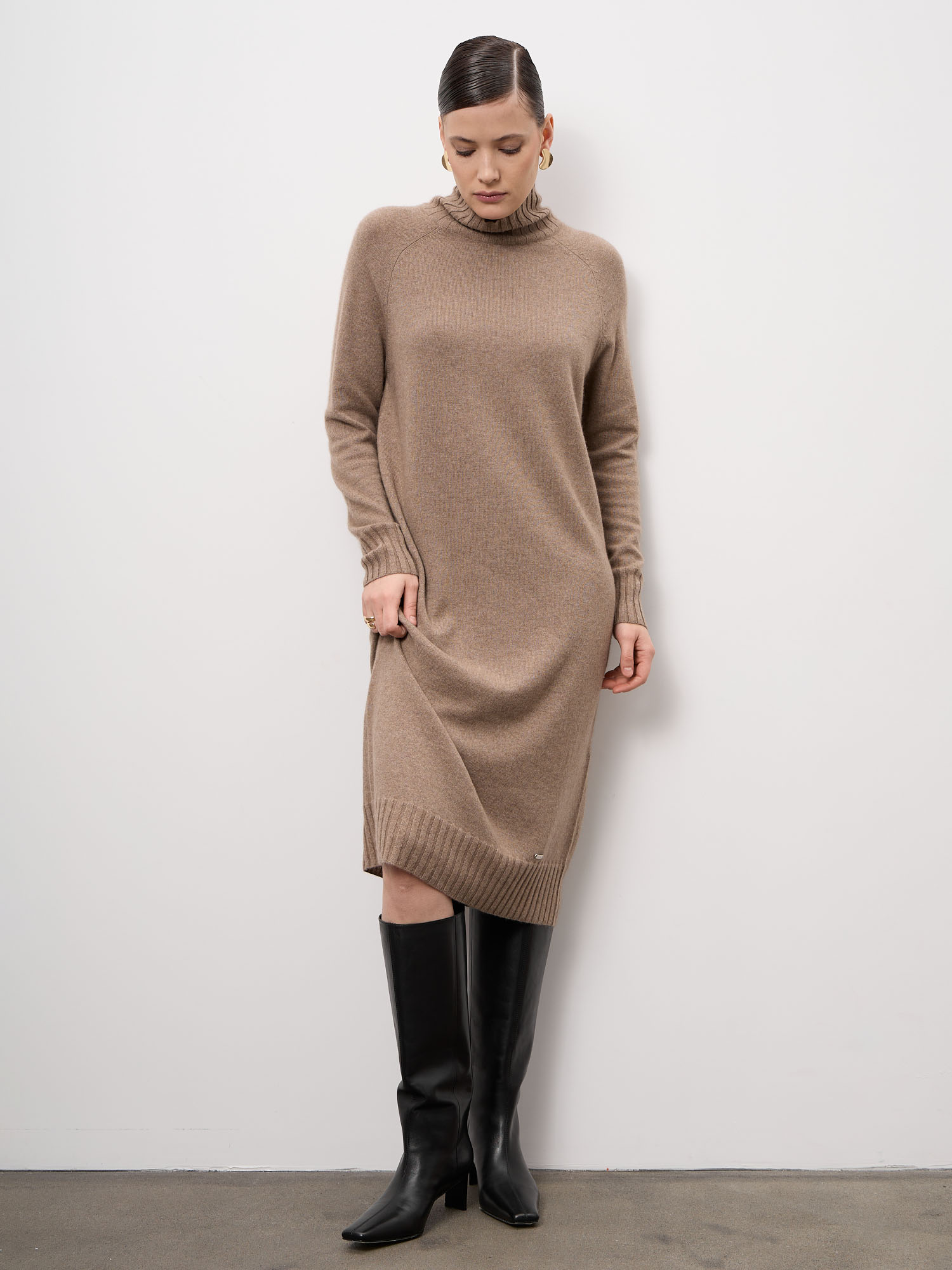 Элегантное платье из натурального кашемира в оттенке капучино — воплощение сдержанной роскоши и комфорта. Модель прямого силуэта мягко повторяет линии фигуры, создавая утончённый и женственный образ. Благородный цвет легко вписывается в базовый гардероб и подходит для любого сезона.